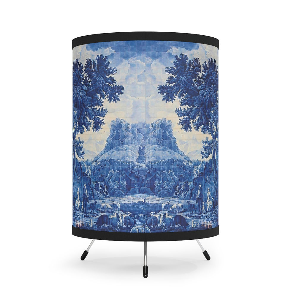 Blue and White Delft Tile Toile Artistic Tripod Lamp with Scenic Blue Landscape